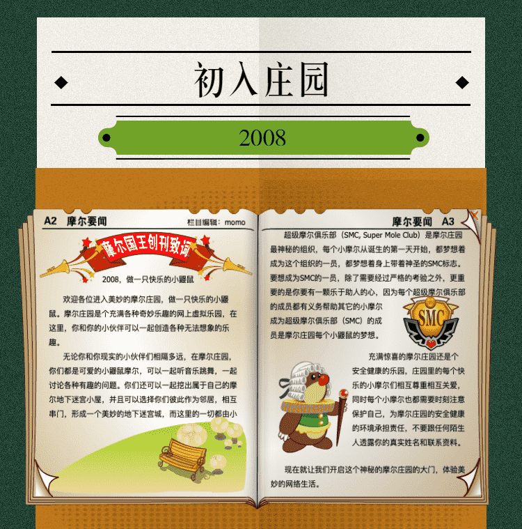 在这一年,,,摩尔庄园诞生了。。。在这里,,大家都是可爱的红鼻子鼹鼠小摩尔,,可以一起勤劳耕作,,一起高山滑雪......我们都是摩尔庄园的建设者。。。
