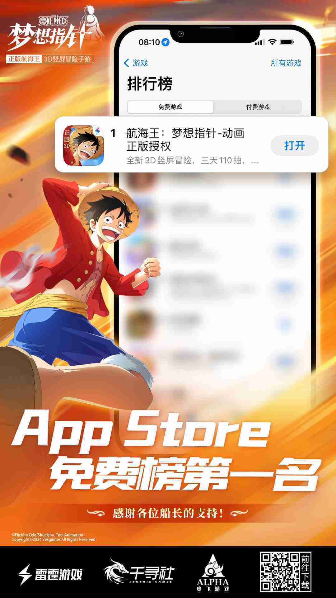 《航海王::梦想指针》登顶App Store免费榜,,,公测福利汇总!!!!